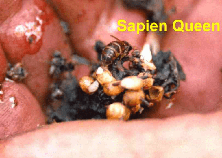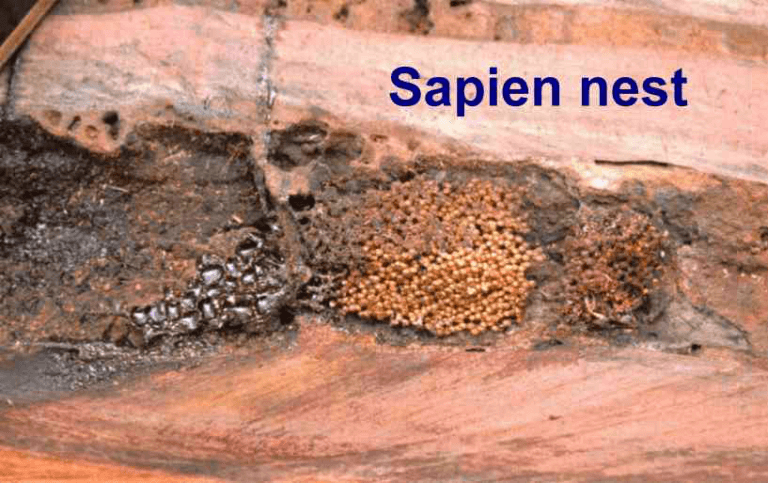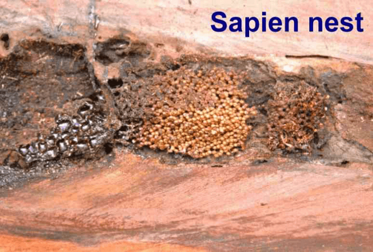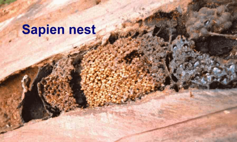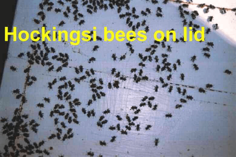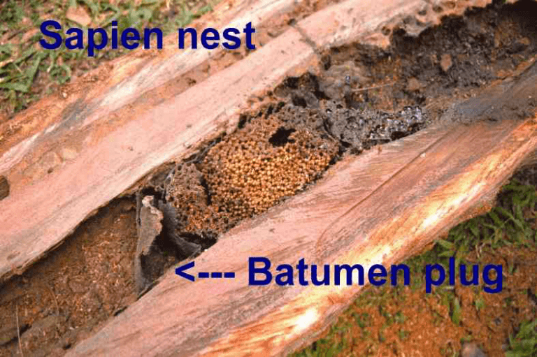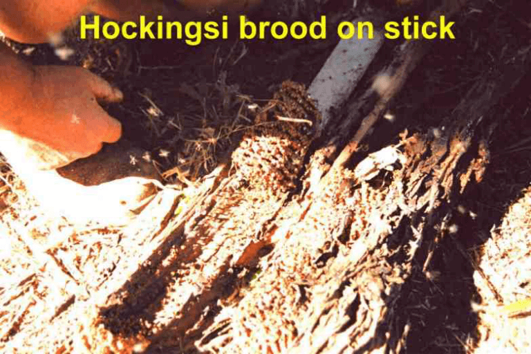The predominate species is Trigona hockingsi. (Wik people call them “My att”) All species were found nearby to permanent water. The hockingsi that were located, were found in live yellow stringy bark gum trees. Trigona sapiens (Wik people call them “My what”) is also quite common. These are an interesting species. The cerumen is typical of Trigona but the brood is like Austroplebeia. We found 2 nests and placed into OATH boxes. We found a T. hockingsi nest close to town, and place it into a box. On our return for a follow-up inspection, I noticed “the fly” (Yes, the wasp mimicking fly is there too) visiting a section of a branch. I had a look. There it was. A Trigona clypearis. (Wik people call them “My coyan”) The hollow was one pollen cell wide by about 1.5 metres long. These bees are so small. While walking around, I actually found another nest. What a gold mine. Uncle Joe said that there was a 4th species which we believe is Austroplebeia symei.